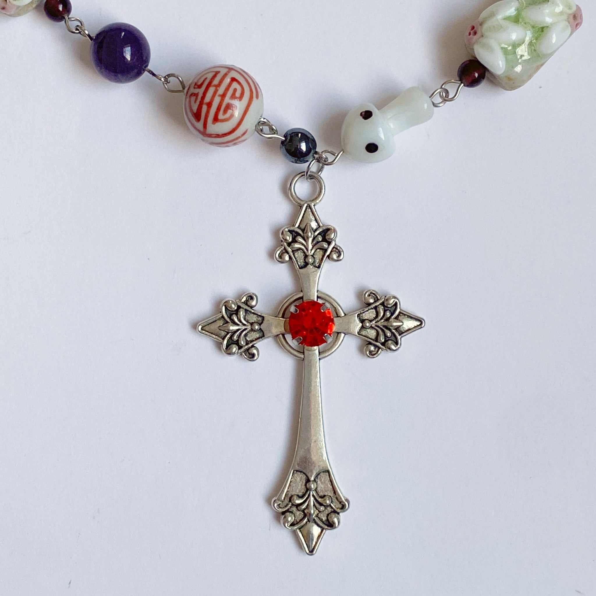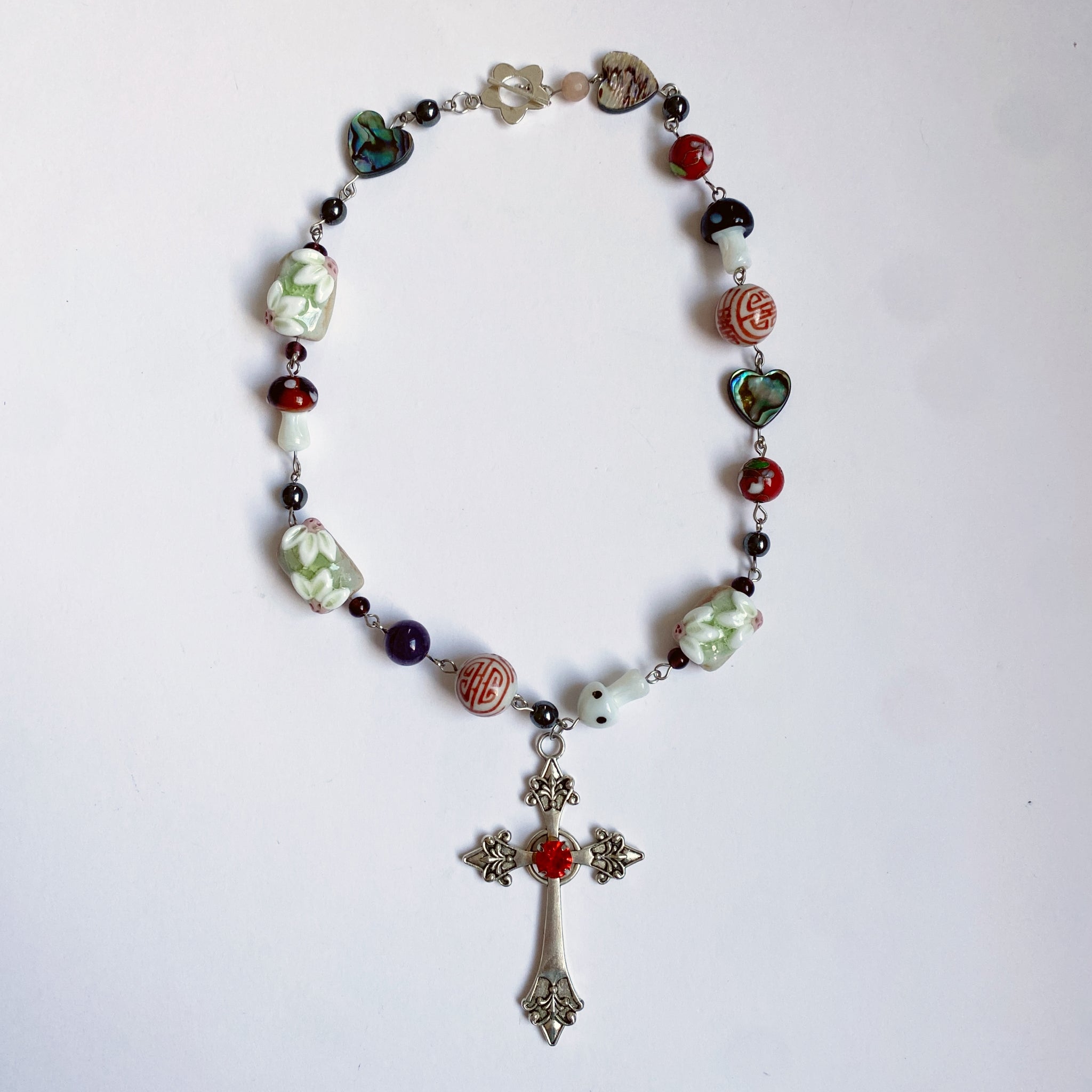 Glass beads, ceramic beads, semi precious stones, wooden beads, shell beads, cloisonné beads, and a cross pendant.