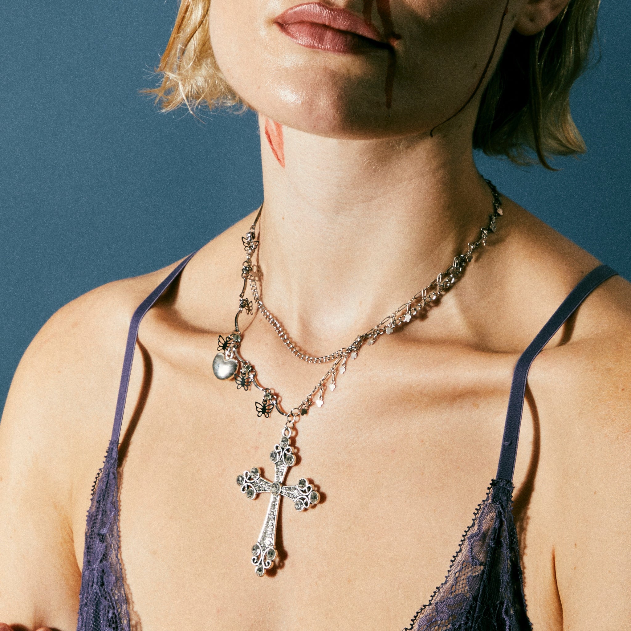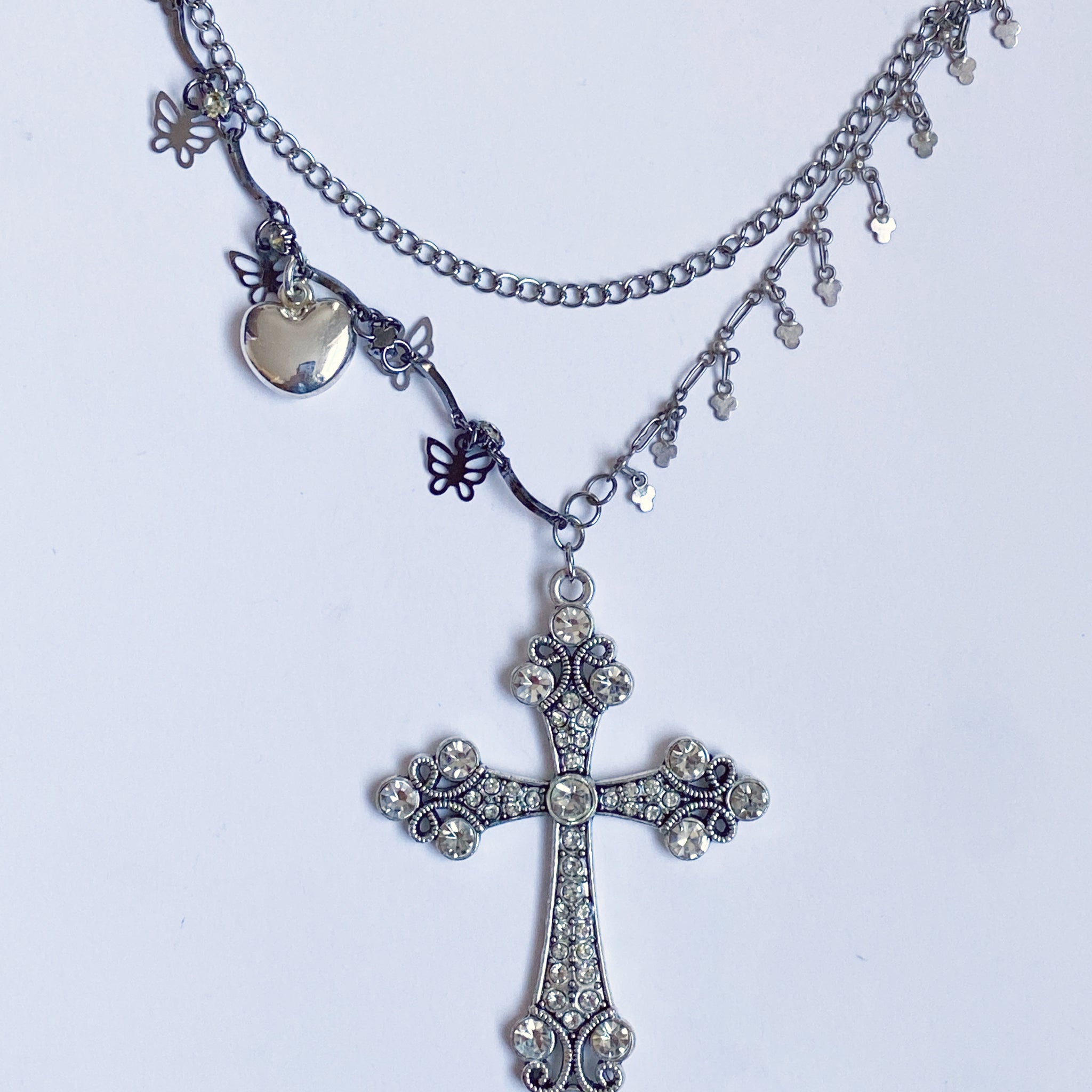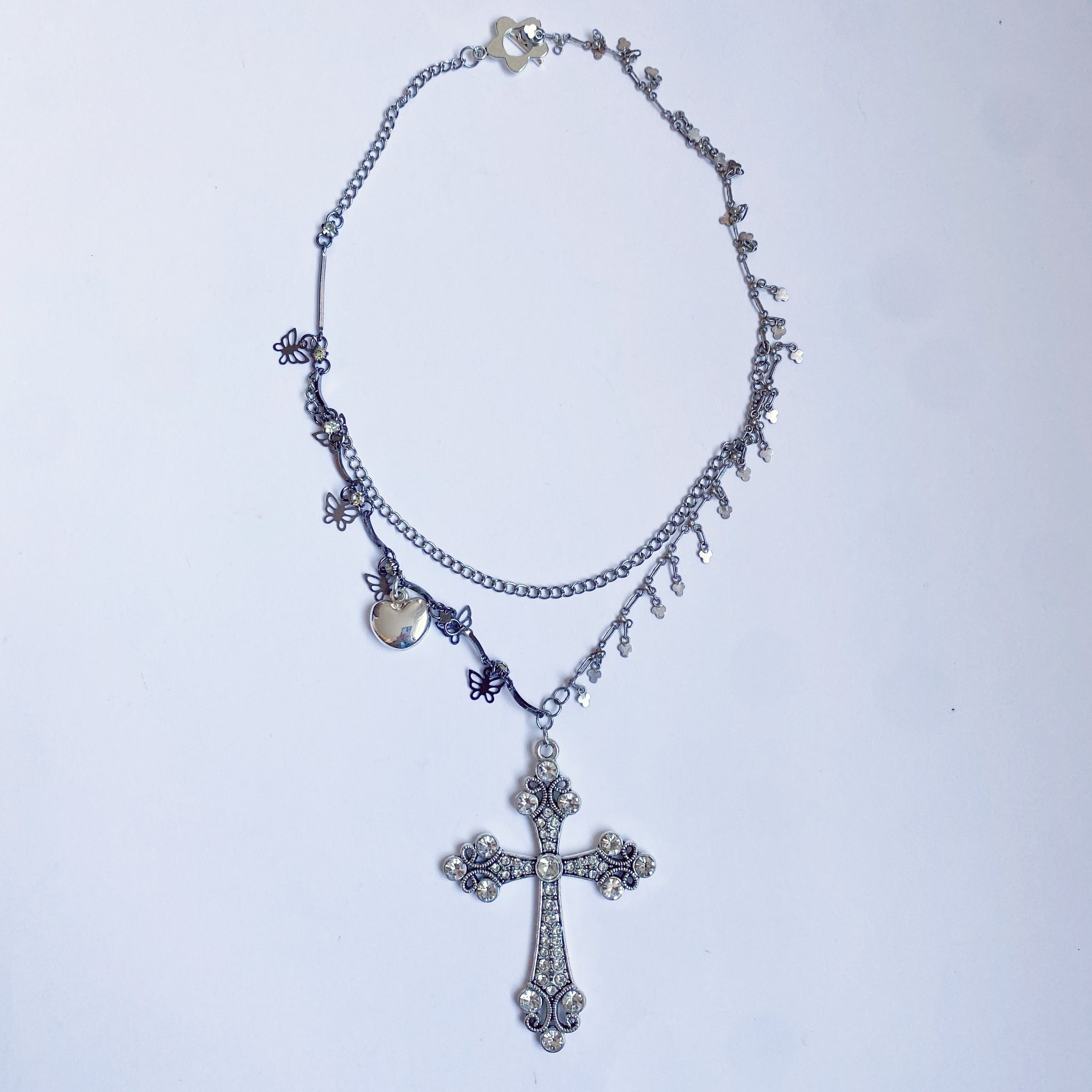 Silver toned hardware and vintage charms.