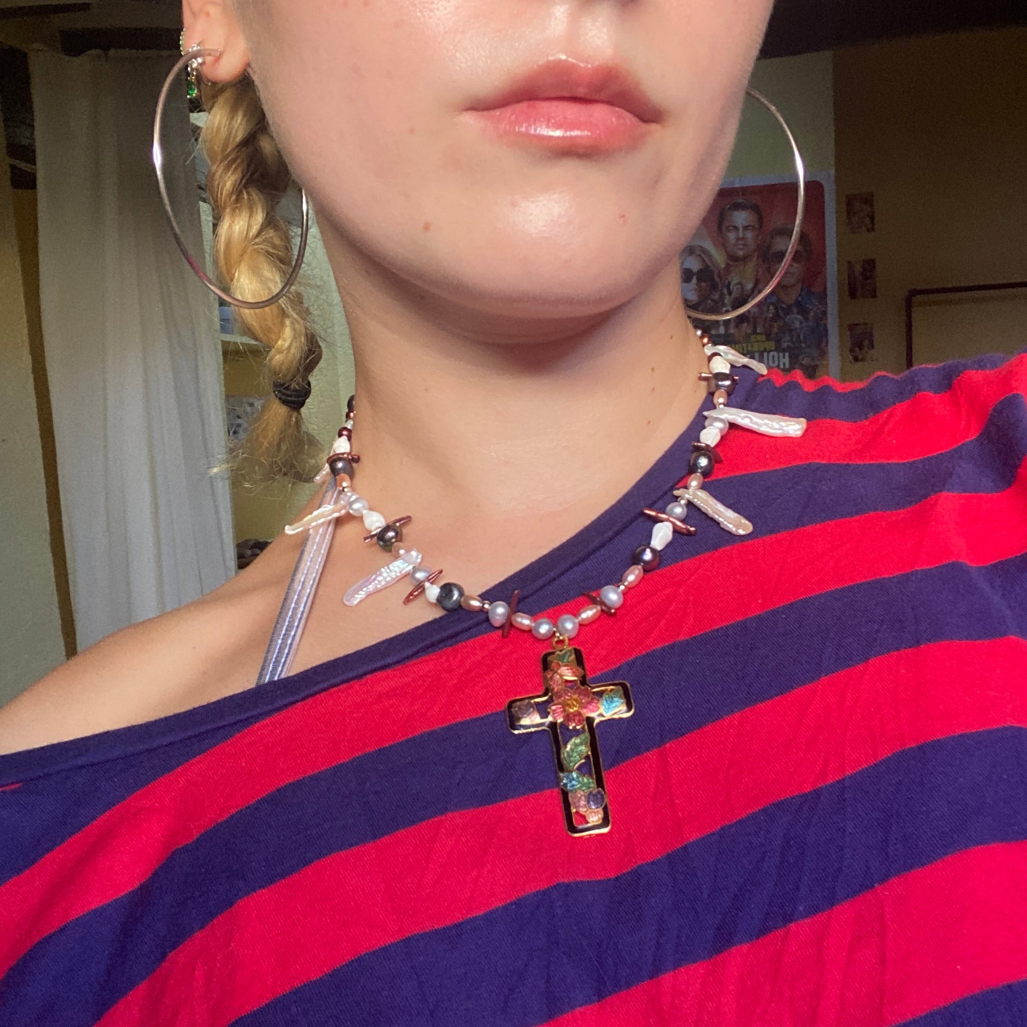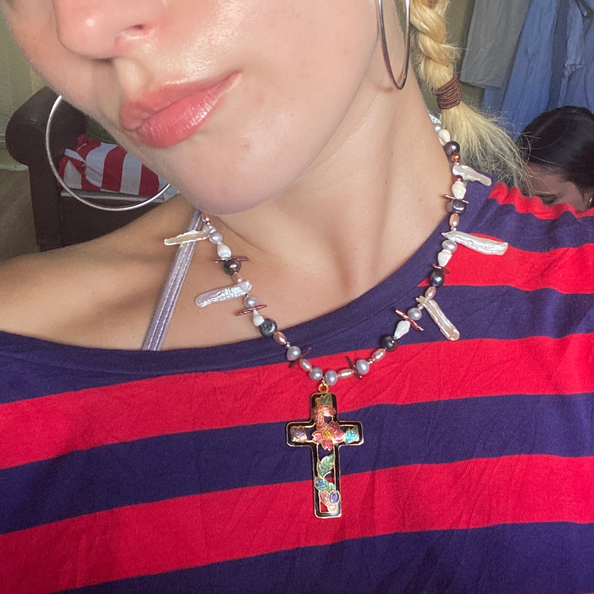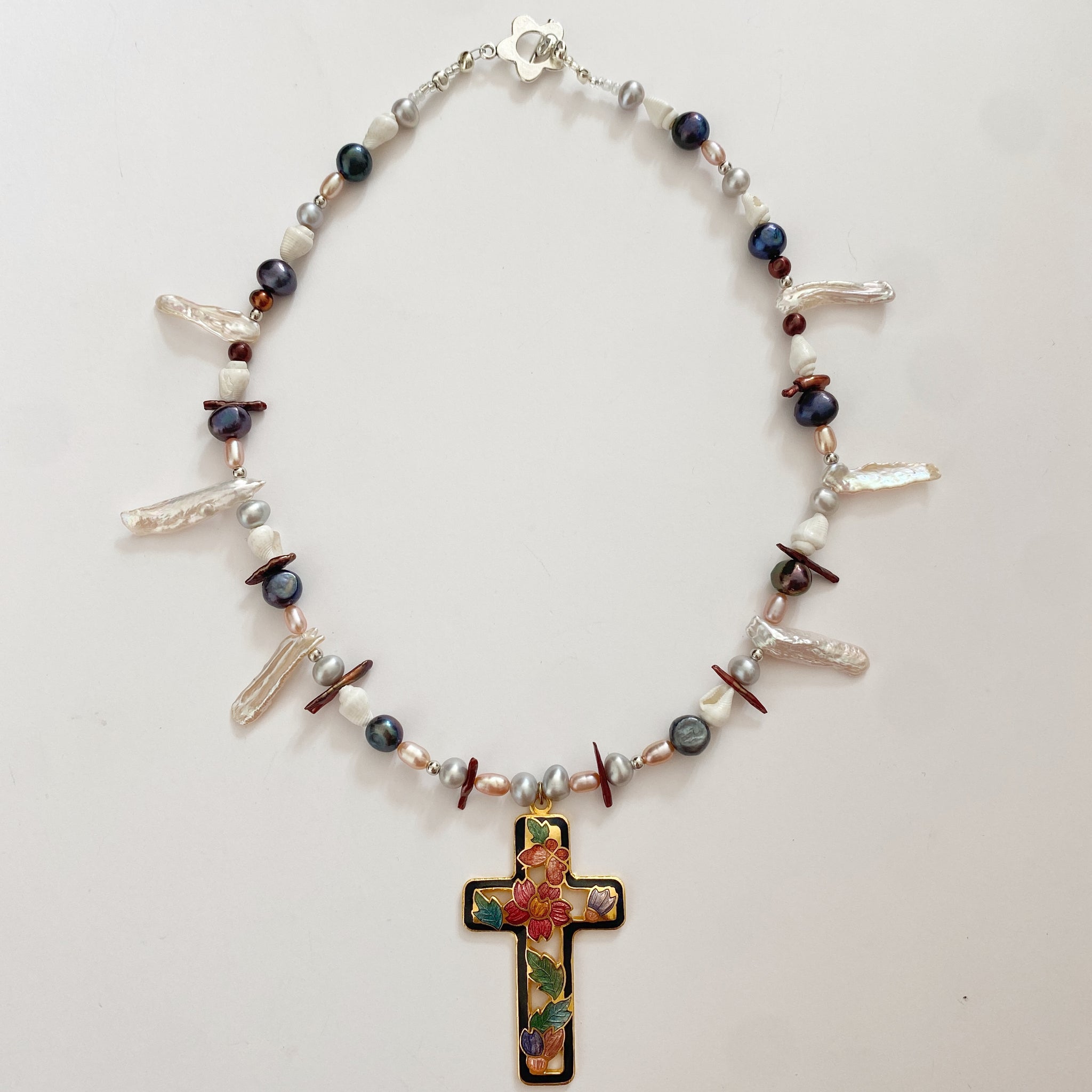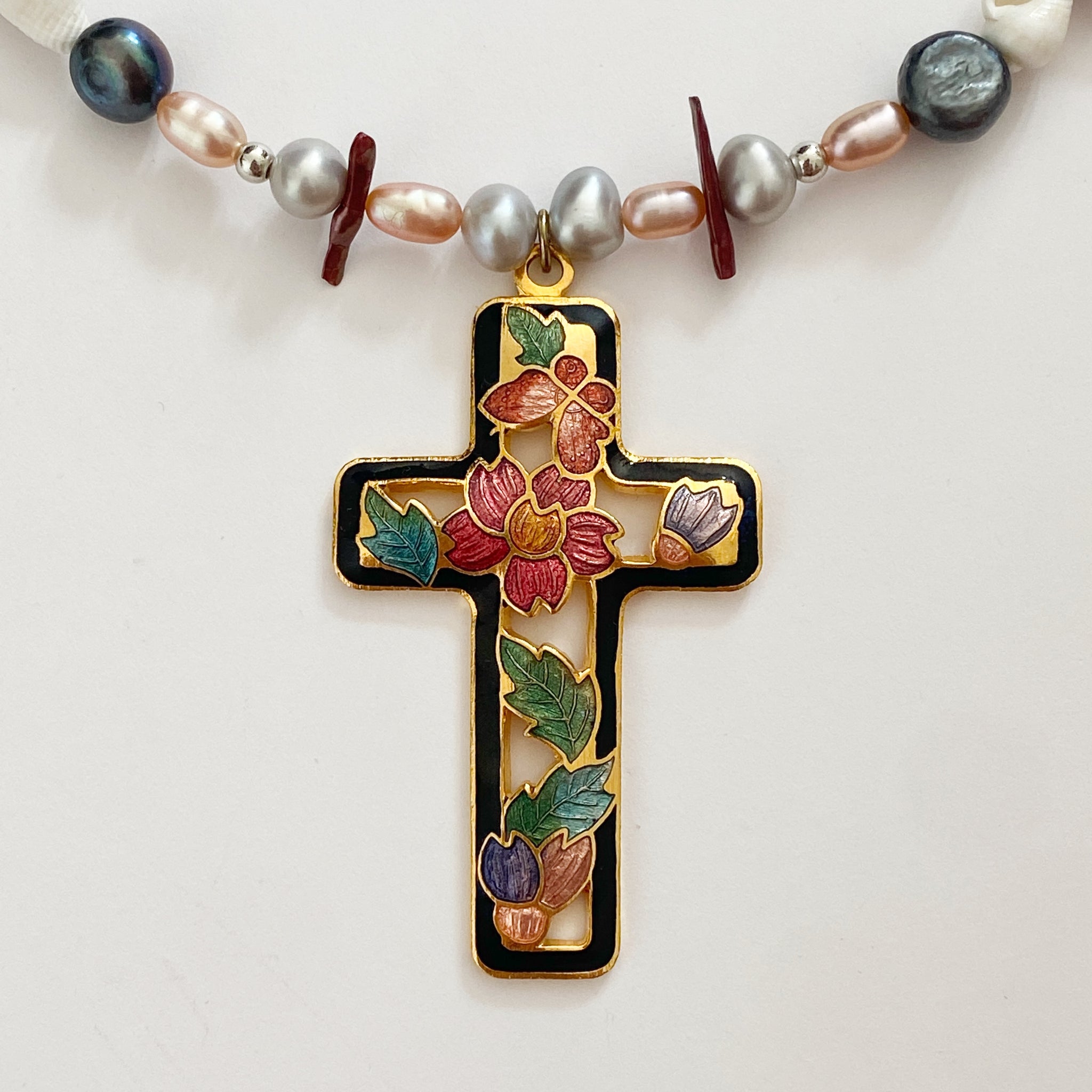 Freshwater and biwa stick pearls, shell beads, and an antique enamel cross pendant.