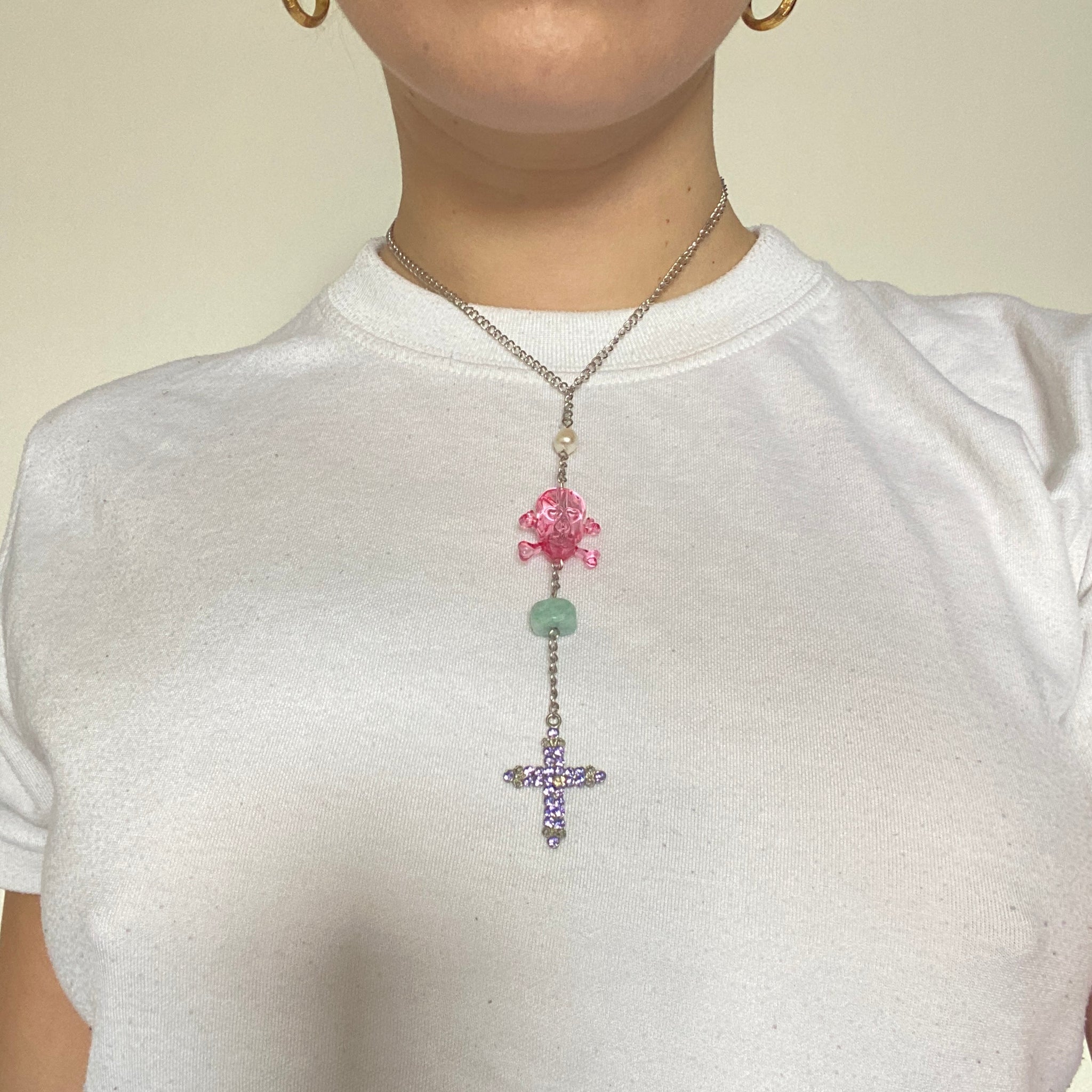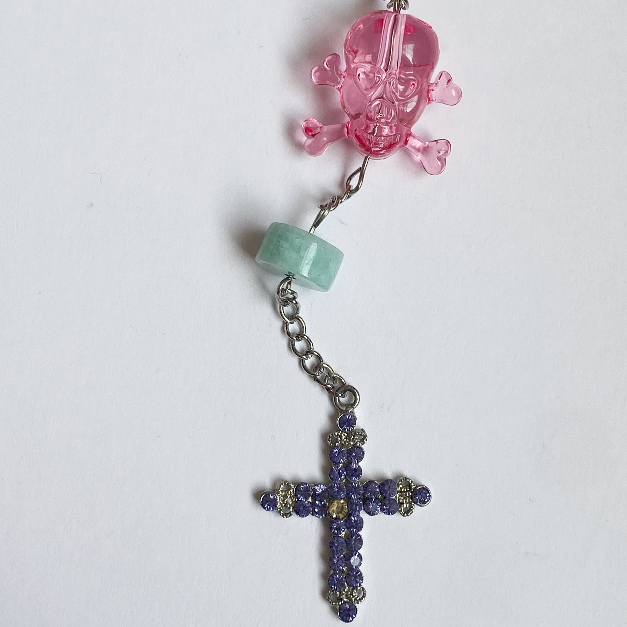 Chain, a skull bead, a semi precious stone, and a diamanté cross pendant.